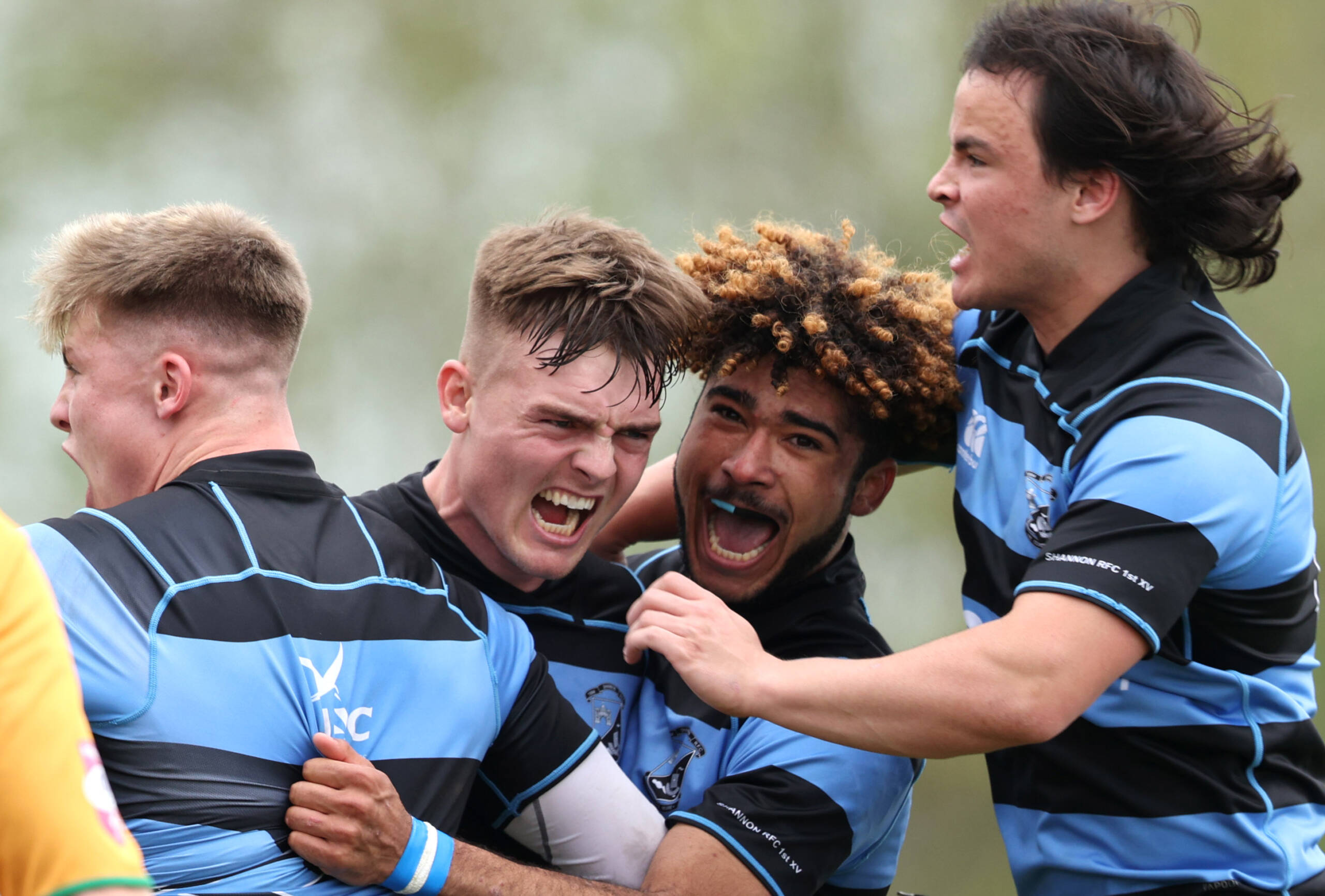 Shannon's Jake Flannery celebrates scoring a try with his brother Alan and team-mates Josh Costello and Killian Dineen ©INPHO/Tom Maher