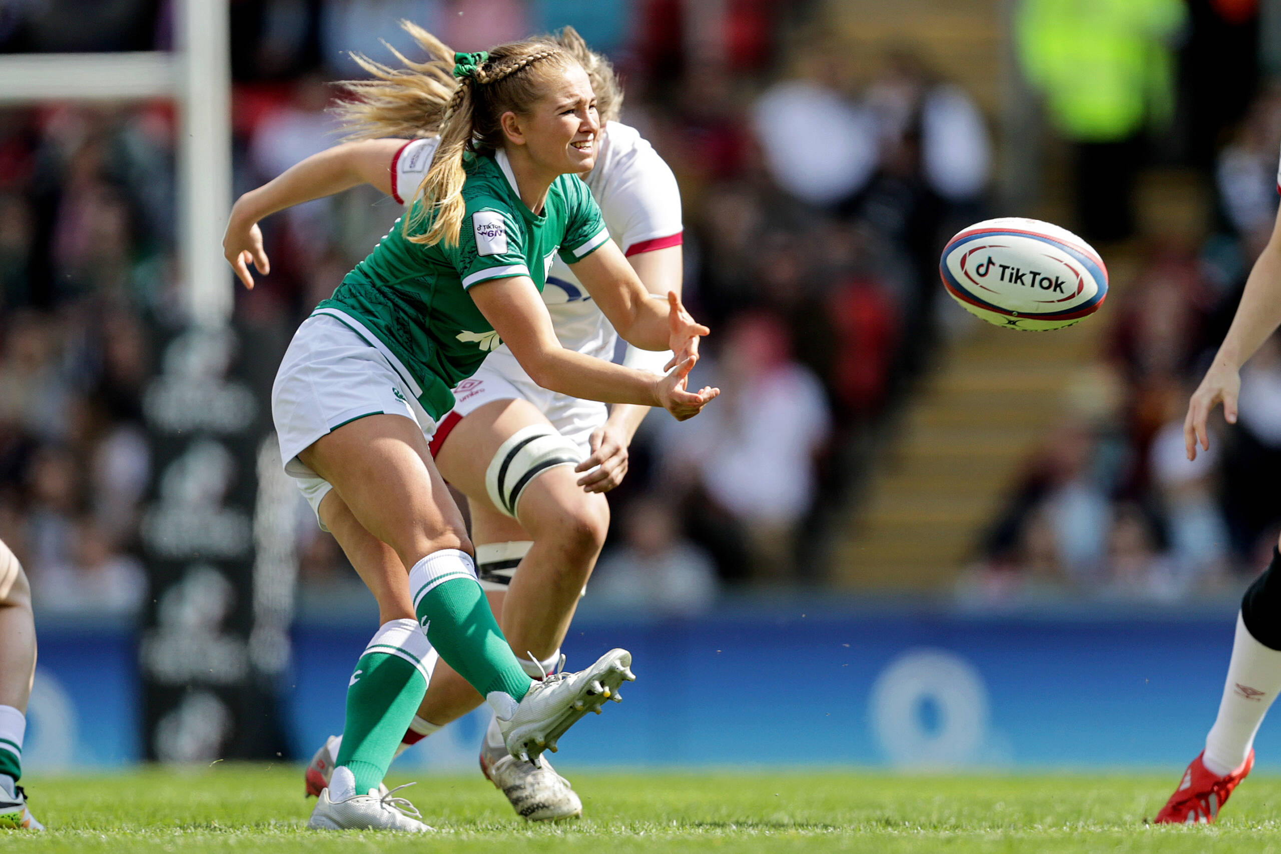 Kathryn Dane throws a pass during Ireland's TikTok Women's Six Nations clash with England in Leicester last year ©INPHO/Laszlo Geczo