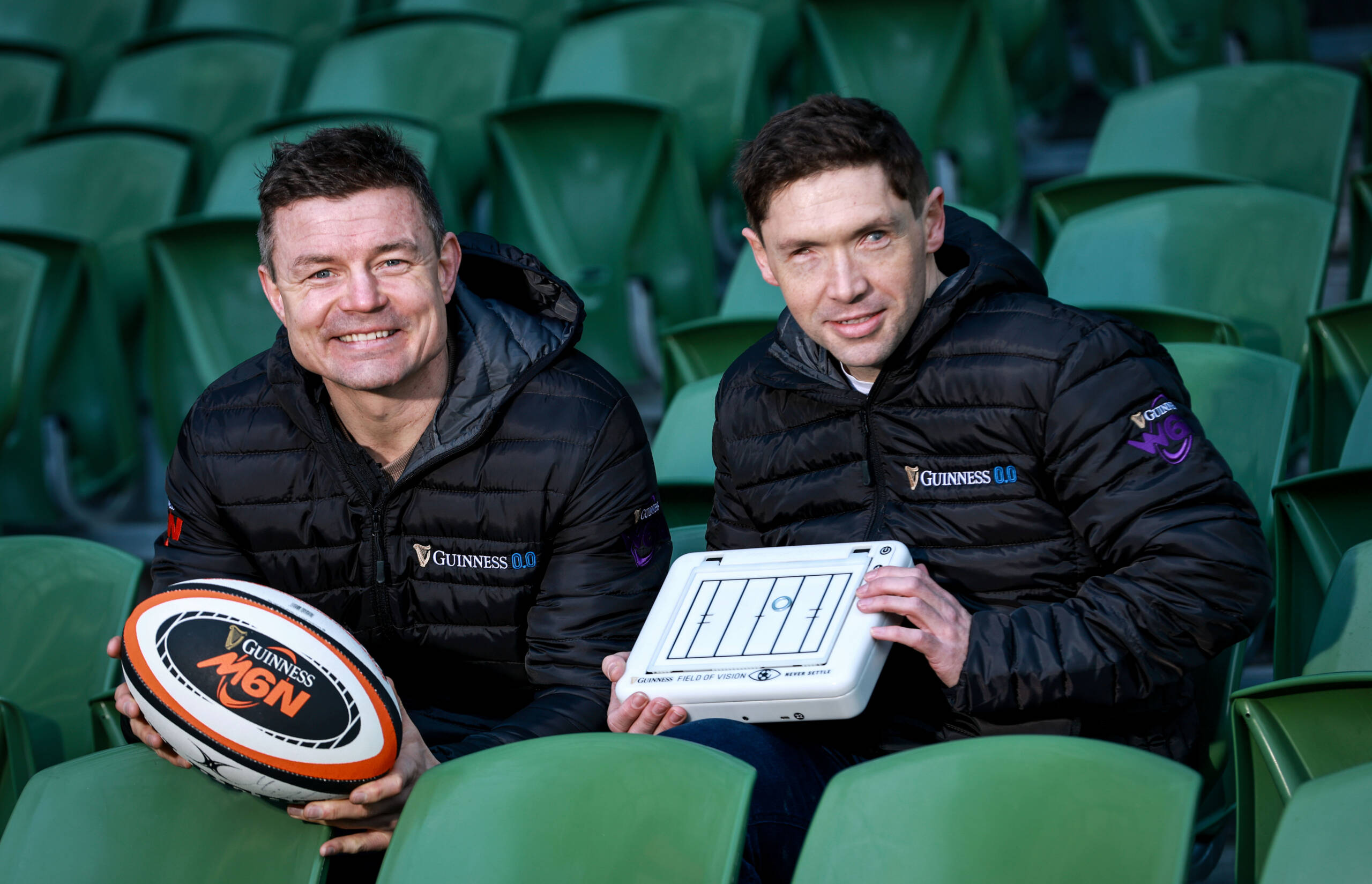 Guinness ambassadors Brian O'Driscoll and Martin Gordon are pictured with the cutting-edge device which uses a touch-based technology and a bespoke haptic language ©INPHO/Dan Sheridan