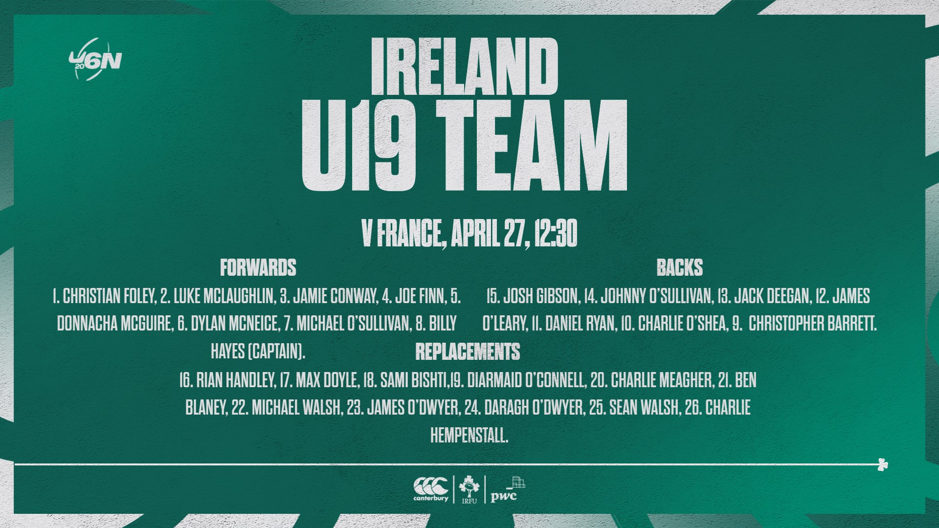 The Ireland U19 team, sponsored by PwC, to play France in the second match at La Roche Sur Yon on Sunday has been named.