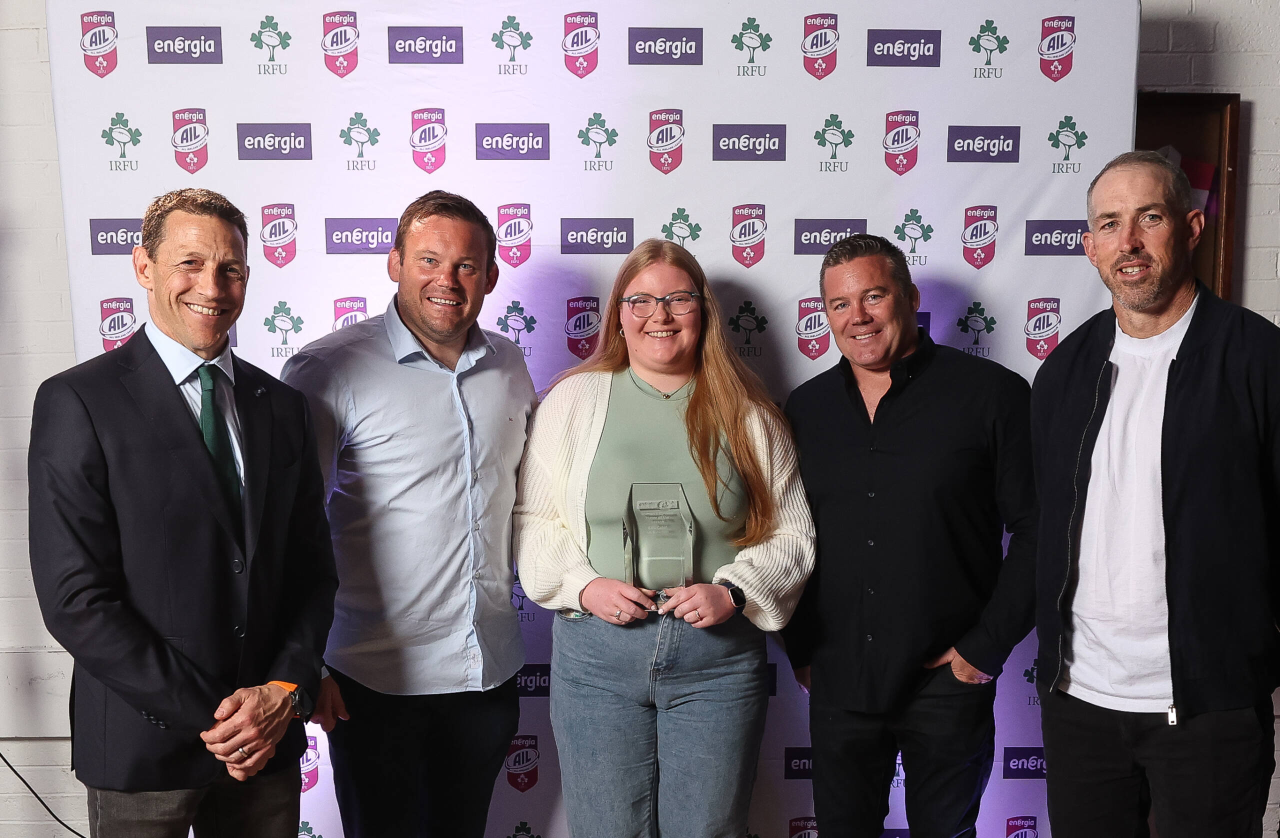 Pictured is Caoilinn Cahill accepting the Energia All-Ireland League Women's Division Player of the Year 2024/25 Award on behalf of her sister Eilís Cahill of UL Bohemian with Ireland’s Women’s Head Coach Scott Bemand, Women’s Scrum Coach Denis Fogarty, National Scrum Coach John Fogarty and Men’s Backs Coach Andrew Goodman Mandatory Credit ©INPHO/Bryan Keane