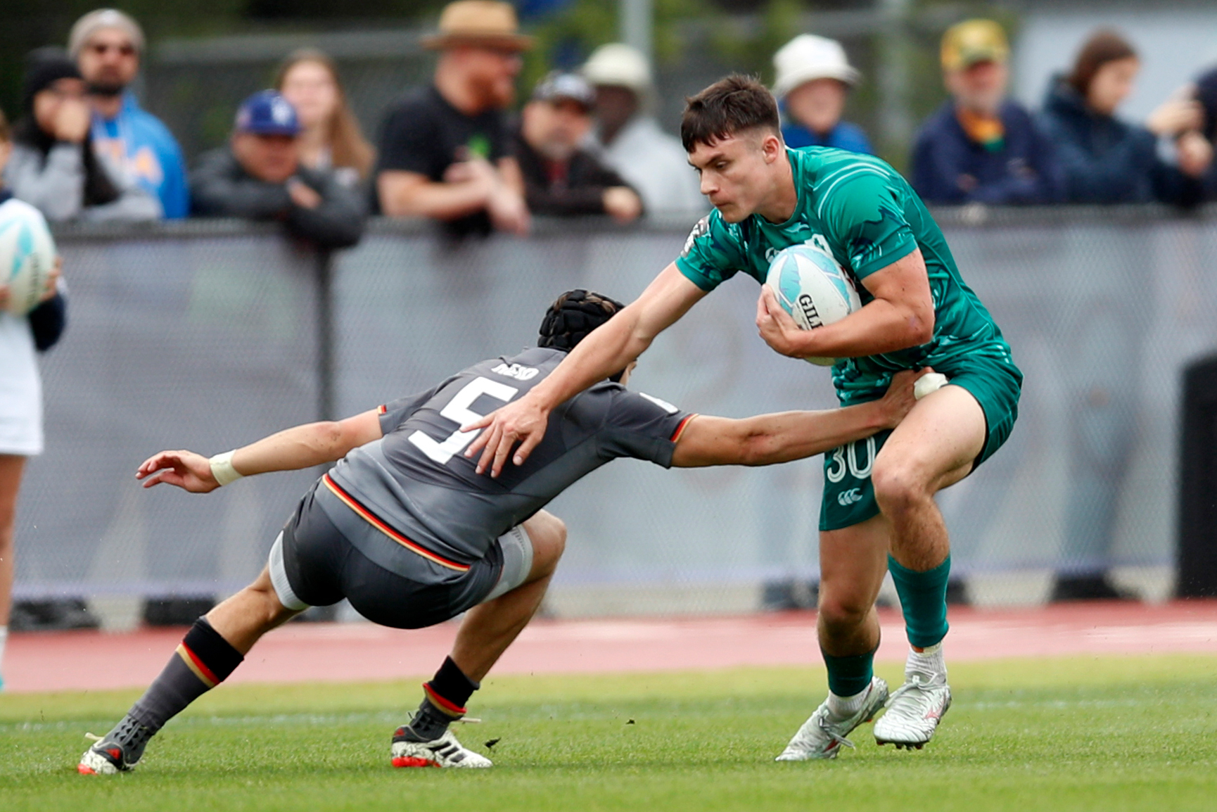 With Josh Costello doing well to collect Ed Kelly’s kick-off in wet conditions, Ireland had the initial possession against Germany but a stray pass allowed the HSBC SVNS Challenger runners-up to build from inside their own half.