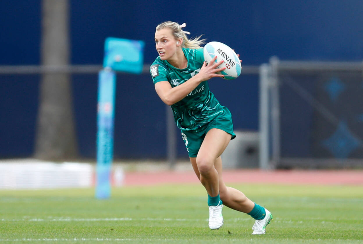 Ireland Women's Sevens captain Megan Burns is pictured in possession during the opening day of the HSBC SVNS Play-Off competition in Los Angeles ©INPHO/Joe Hamby
