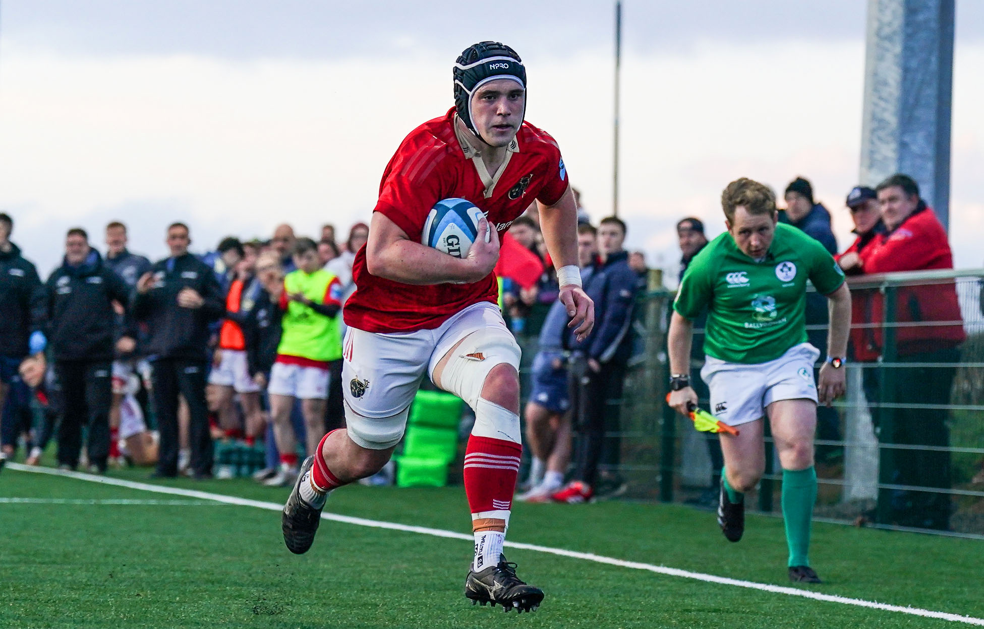 Ireland U-20 international Oisín Minogue is pictured running in a try for Munster 'A' against Ulster 'A' during this past season's IRFU 150 'A' Interprovincial Championship ©INPHO/James Lawlor
