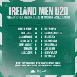 Head coach Neil Doak has announced the Ireland Under-20 Men’s team (sponsored by PwC) for Sunday’s opening Pool C match against Georgia at the 2025 World Rugby U-20 Championship in Italy.