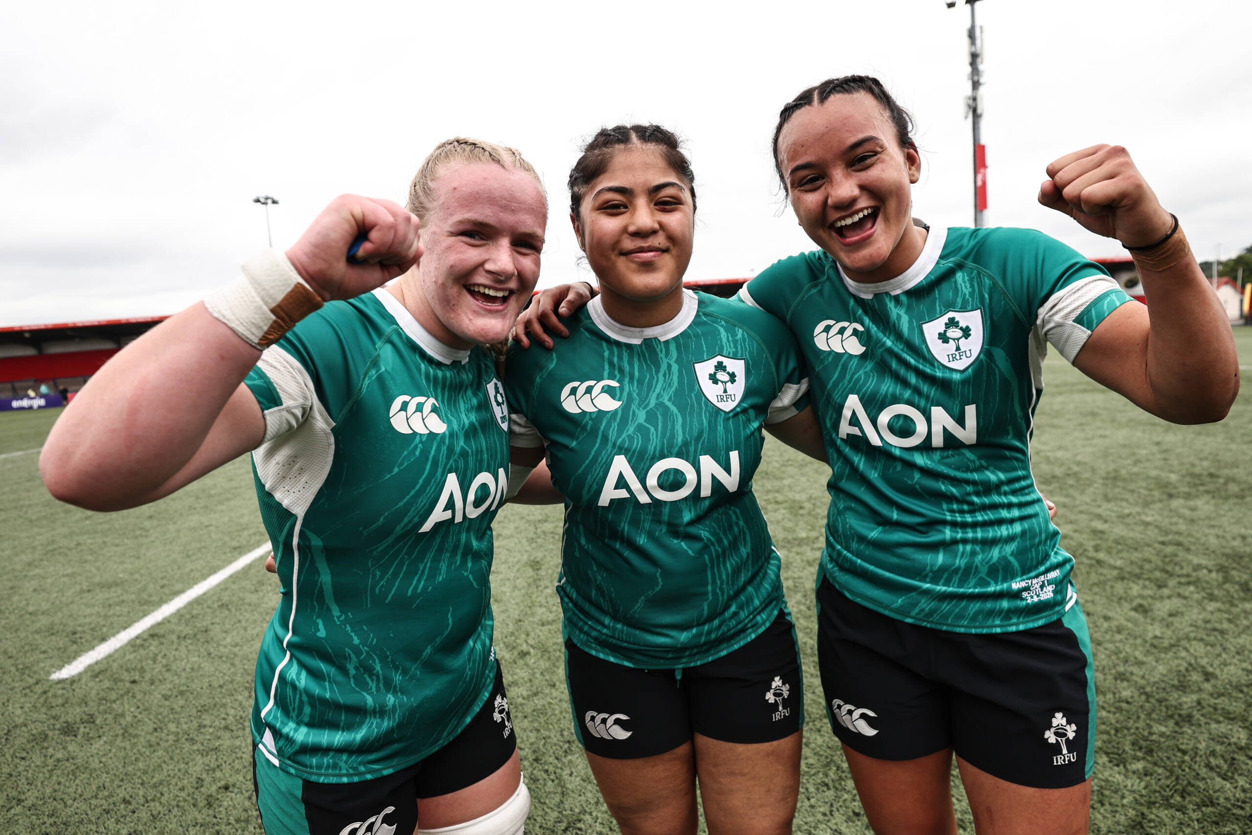 Debutants Ailish Quinn, Ivana Kiripati, and Nancy McGillivray are pictured together following Ireland's 27-21 victory over Scotland at Virgin Media Park ©INPHO/Ben Brady