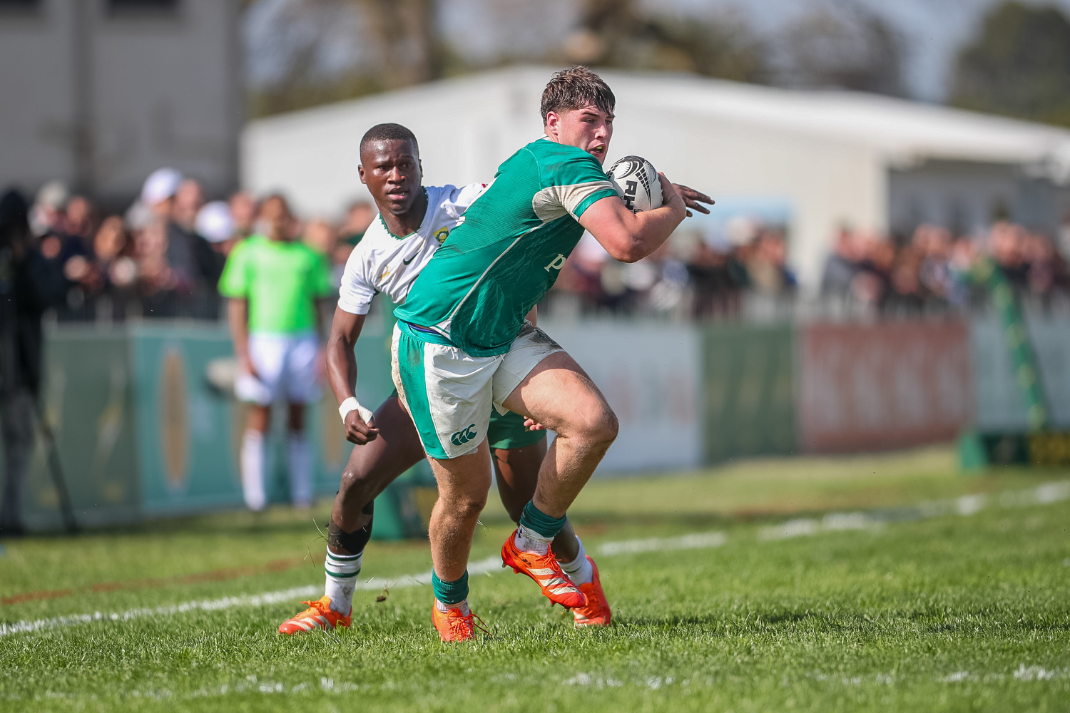 A foot in touch denied South Africa U-18 ‘A’ skipper Uithaler what would have been a swashbuckling breakaway try, and Ireland gradually clawed back those lost metres. Harry Gosling secured turnover ball, and fellow replacement Daniel O’Connell displayed his high-fielding skills.