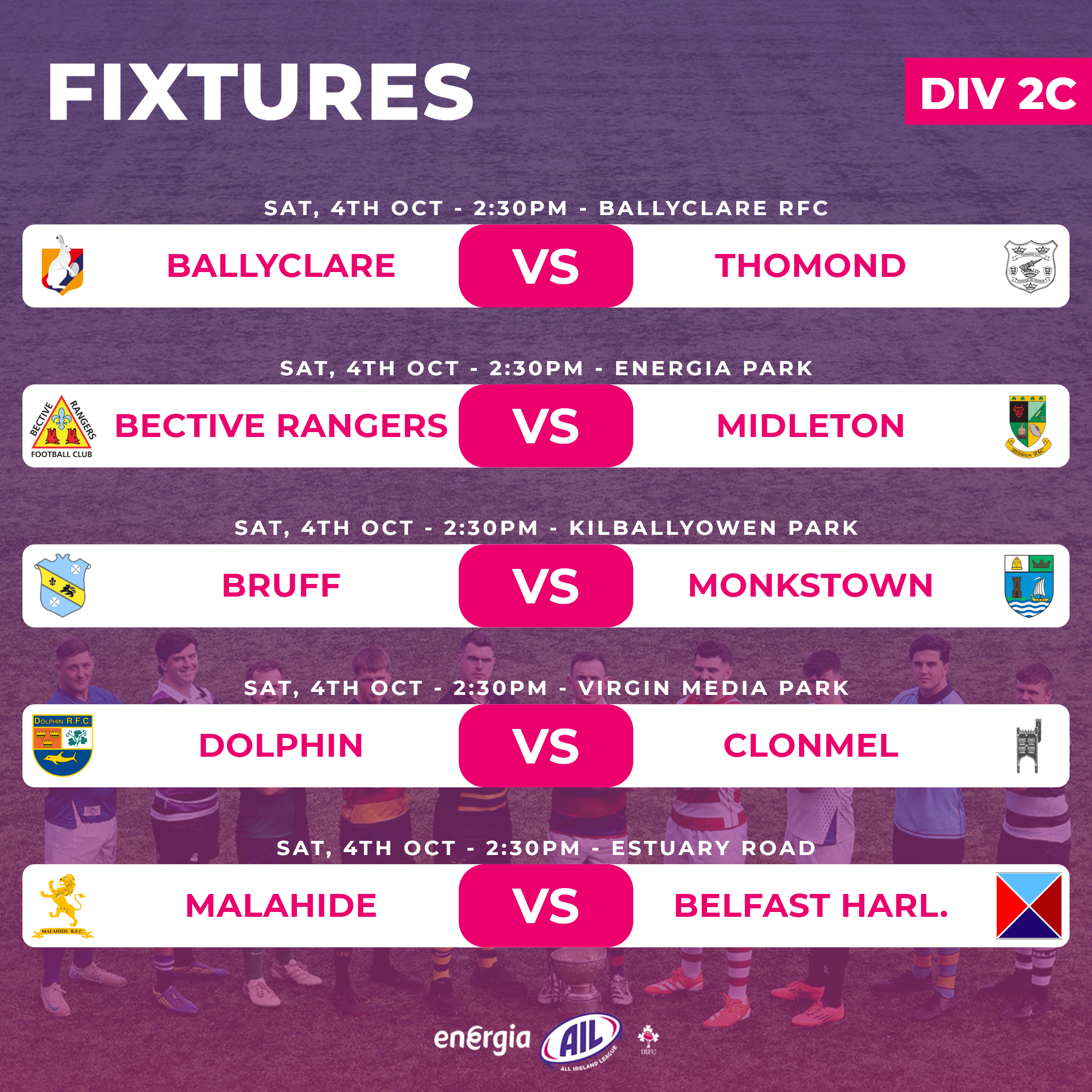 Monkstown, top of the division after the first game, are on the road to Bruff this weekend while Midleton make the trip to Energia Park to play Bective.