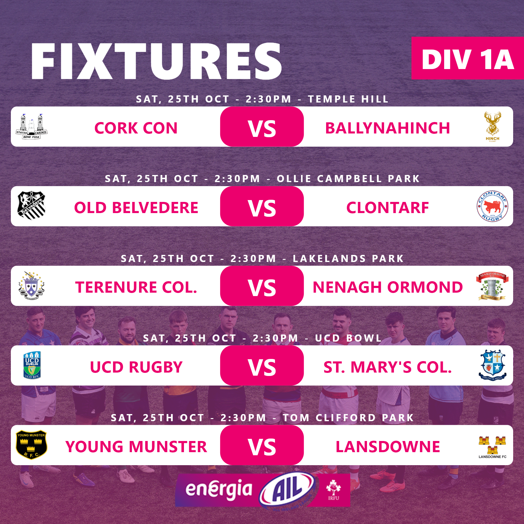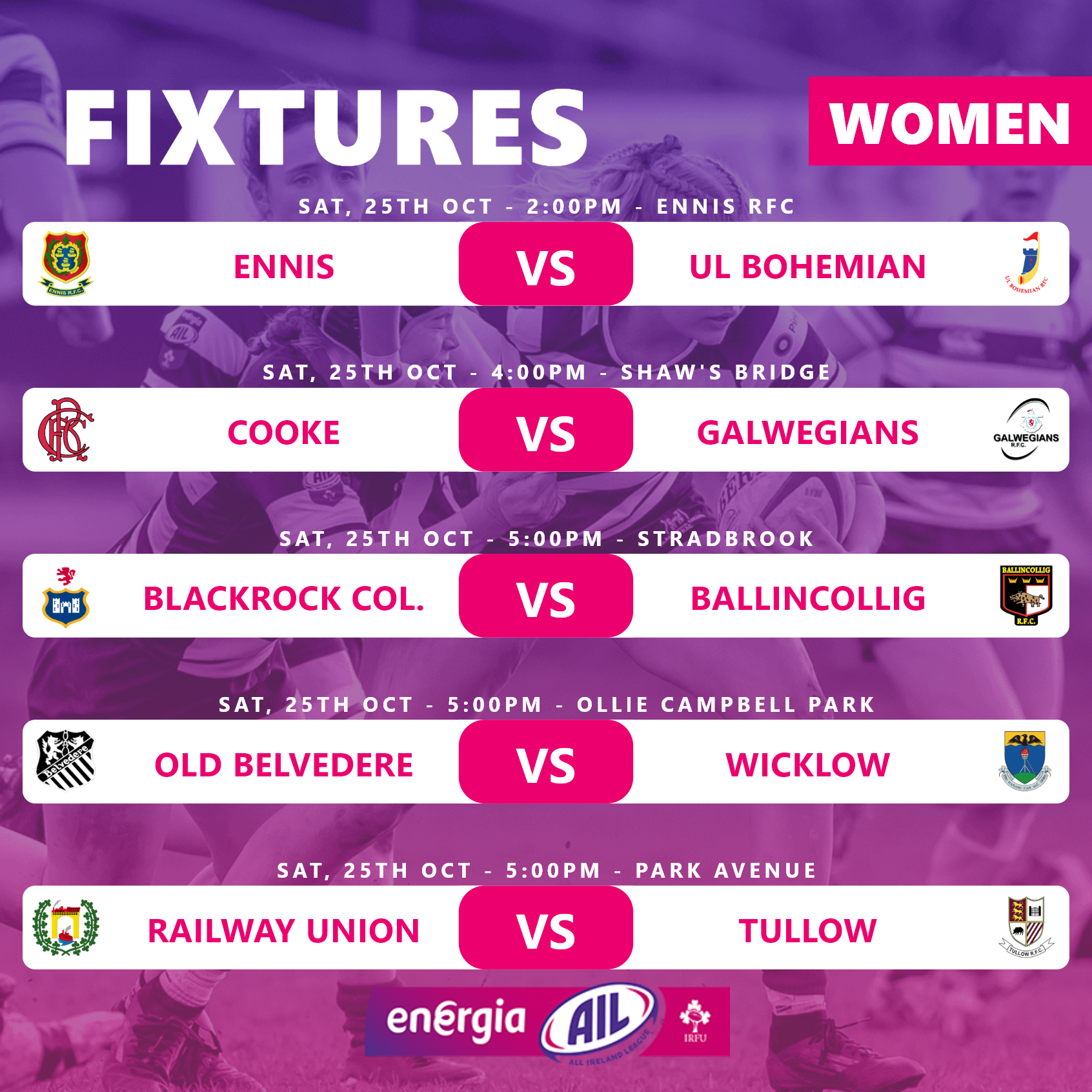 There is a full round of fixtures across all divisions in the Energia All-Ireland League on Saturday, and a feature live match on irishrugby+ in the Women’s Division between Old Belvedere against Wickow.