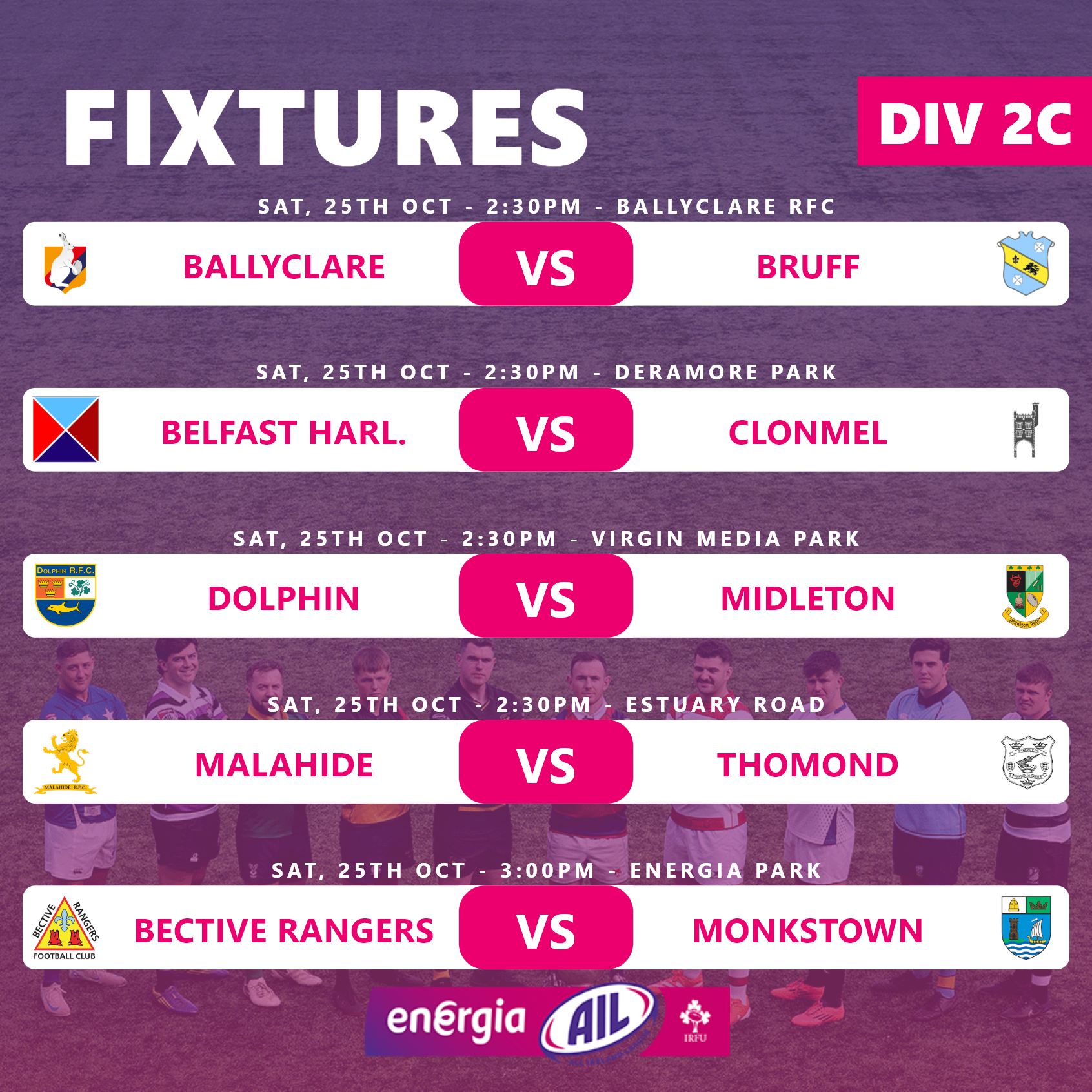 Bottom plays top at Estuary Road where winless Maladide host table toppers Thomond. Elsewhere on Saturday, second-placed Monkstown make the short trip to Energia Park to face Bective, and there is a Cork derby as Dolphin, in eighth, play Midleton, who are four places above them.