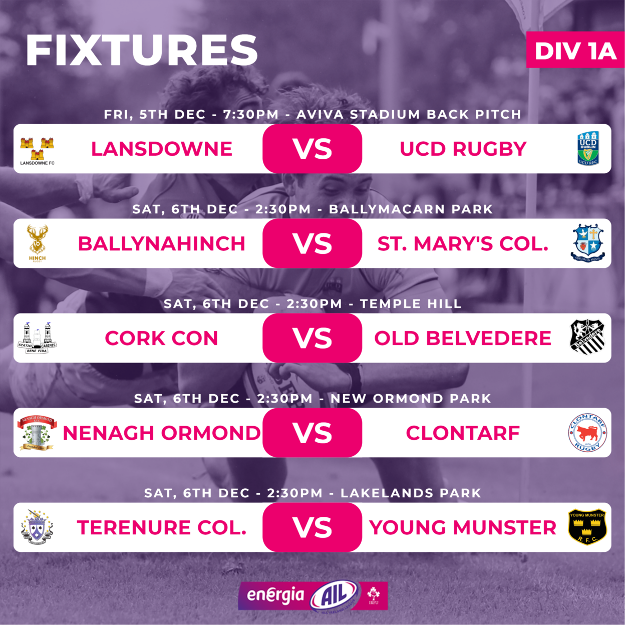 The Energia All-Ireland League’s penultimate round before the Christmas break kicks off tonight with Lansdowne entertaining UCD, while Saturday’s schedule includes a tough test for Division 1A leaders St. Mary’s College, away to Ballynahinch.