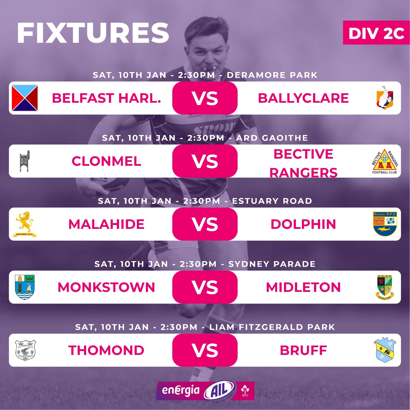In a tight top four, the meeting of second-placed Clonmel and Bective Rangers, in third, is a tasty one to kick off 2026 in Division 2C. Elsewhere, the return Limerick derby between table-topping Thomond and Bruff should be a cracker.