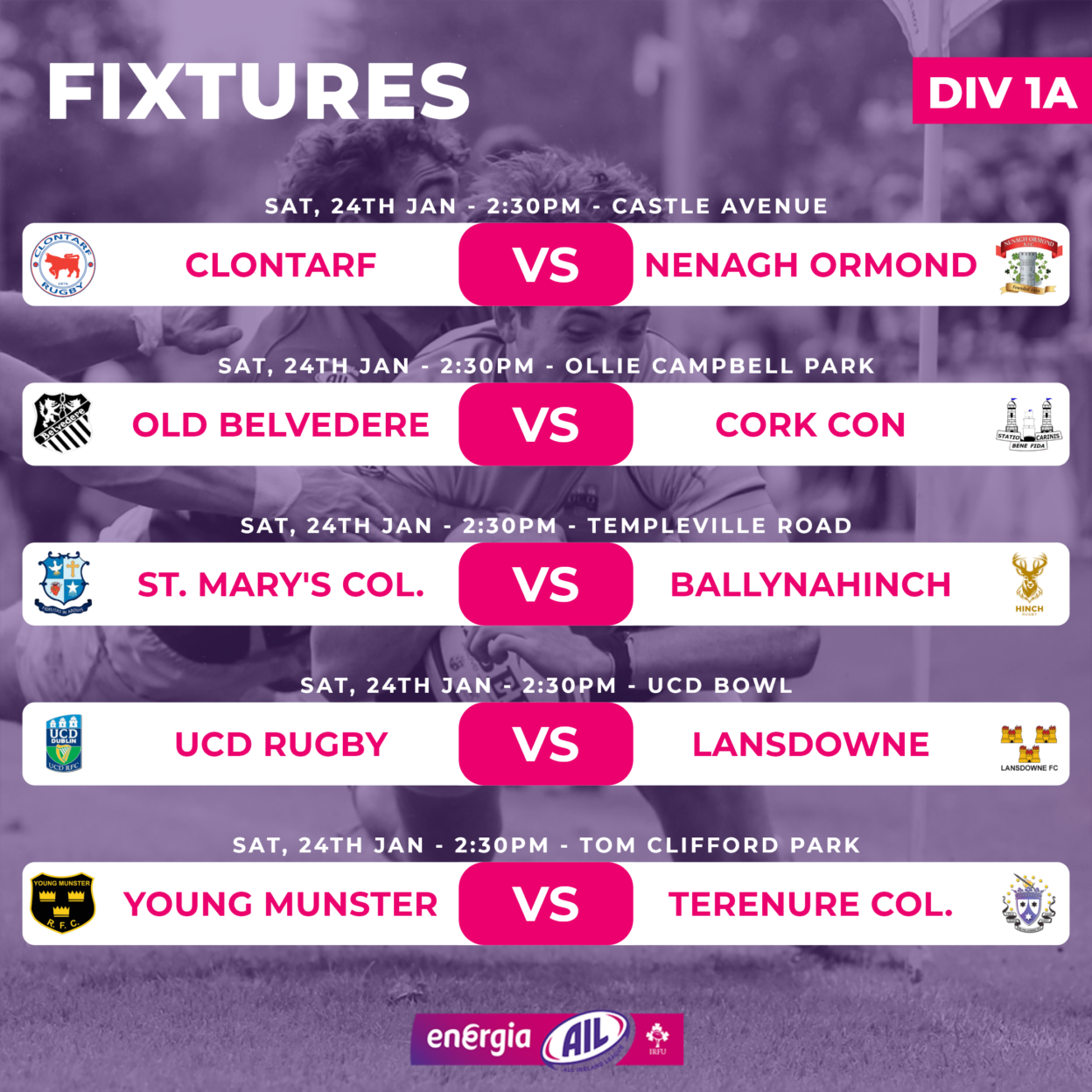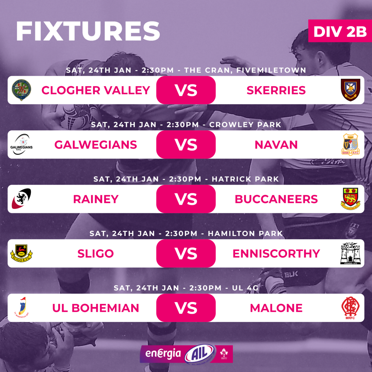 With a perfect 50 points on the board from 10 straight bonus point wins, Galwegians sit 15 points clear ahead of the visit of Navan. Meanwhile, Malone, in fifth, travel to third-placed UL Bohemian, hoping for a result that keeps them in the hunt for a top four finish.