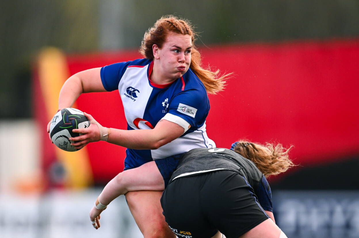Player-of-the-match Fiona Tuite comes up against Poppy Mellanby during the Wolfhounds' Celtic Challenge encounter with Glasgow Warriors in Cork ©Shauna Clinton/Sportsfile