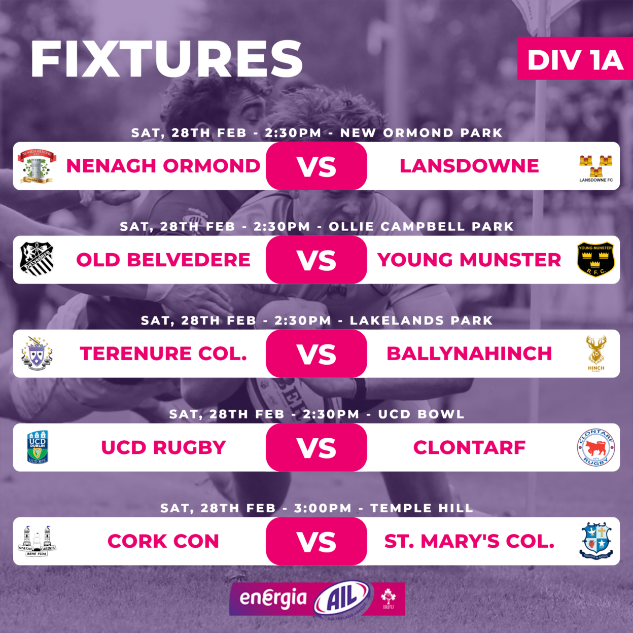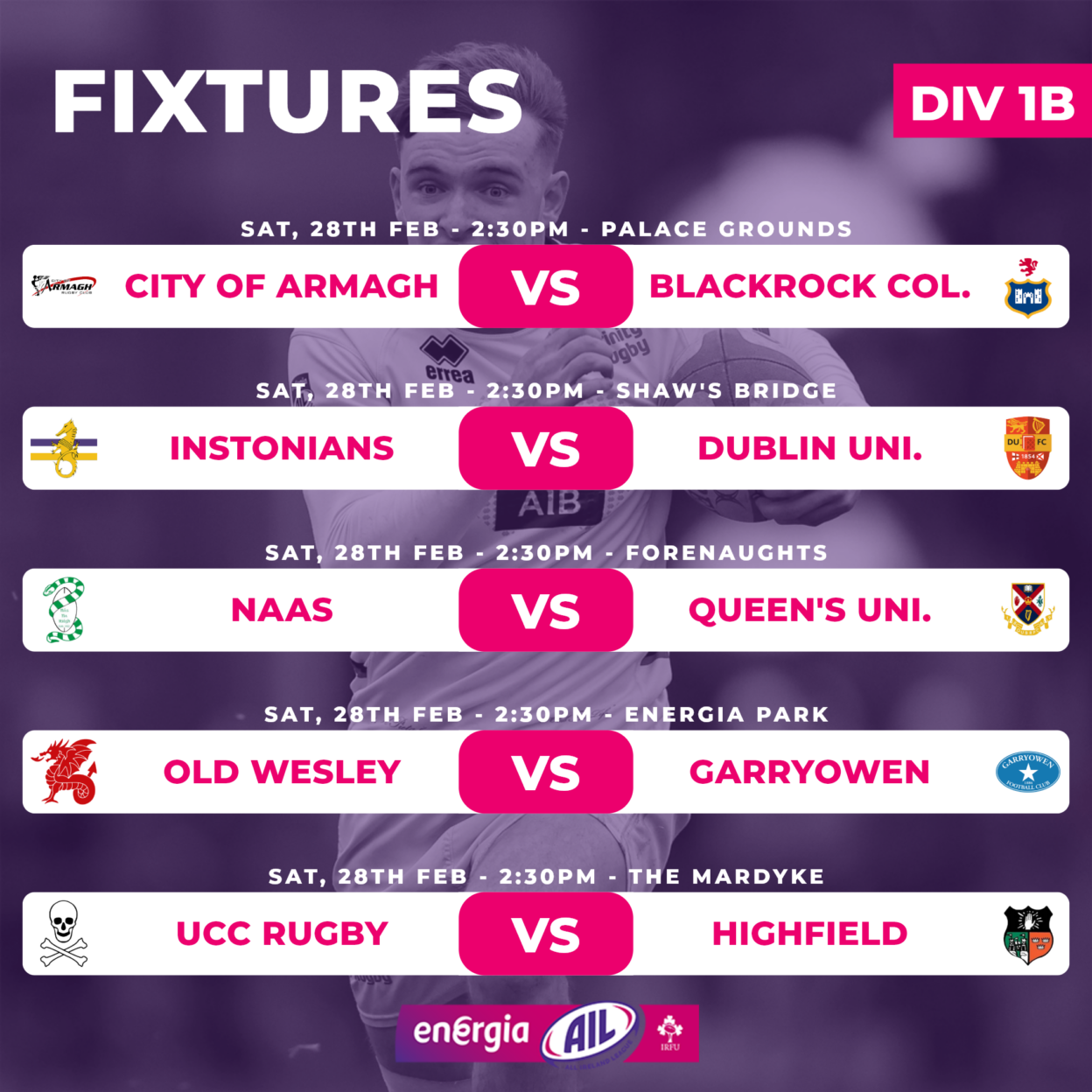 Match of the day in 1B has to be the clash between Instonians (3) and Dublin University (2) – level on points, the sides are separated by a single points difference going into this game. Blackrock (8) face a tricky trip to City of Armagh (5) while Naas (9) could make up ground when they travel to Queens (10).