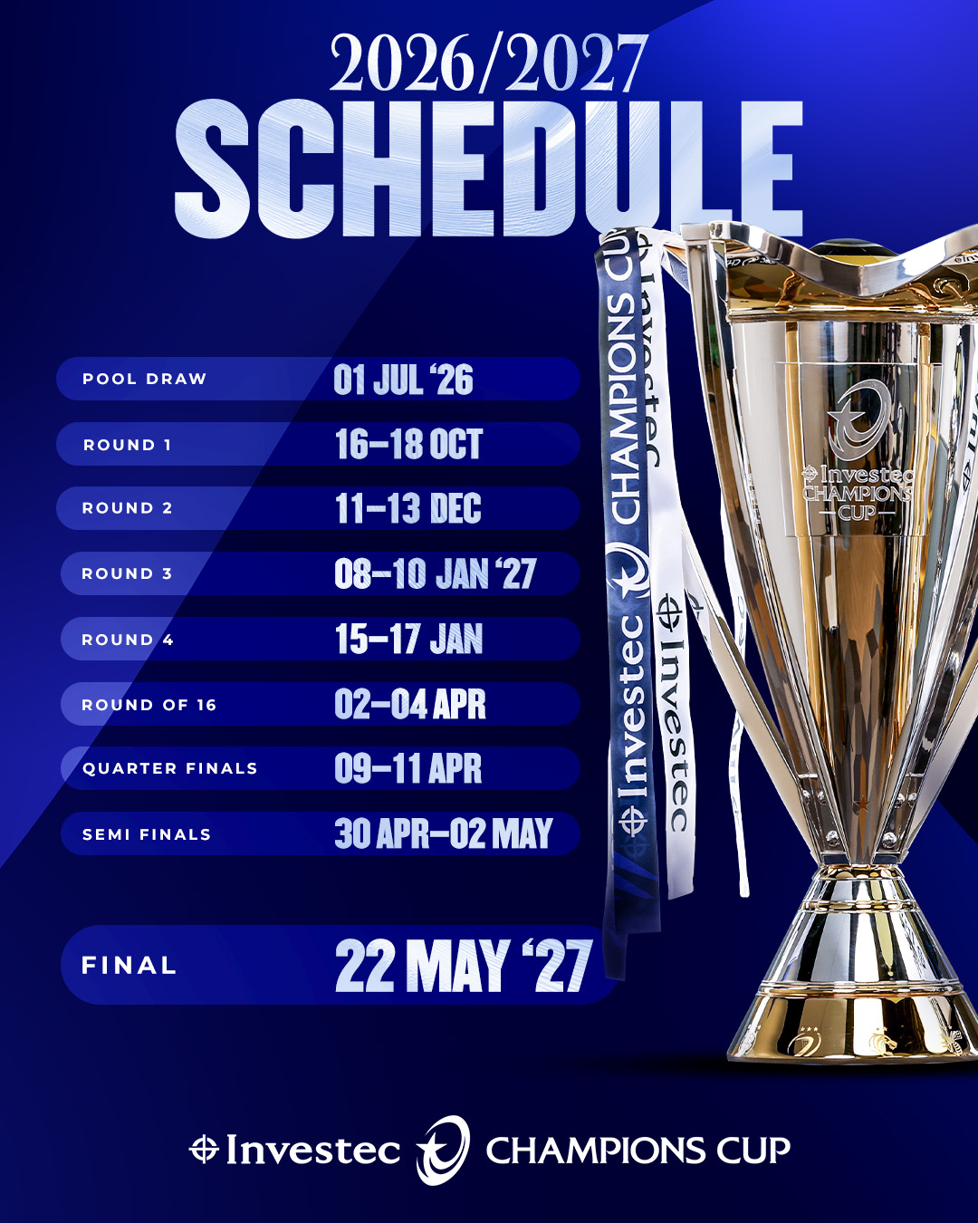 EPCR, who organises the Investec Champions Cup and the EPCR Challenge Cup, has confirmed key dates for the 2026/27 season, with the EPCR finals weekend set to take place on Friday, May 21 and Saturday, May 22 in the French sporting capital of Lyon.