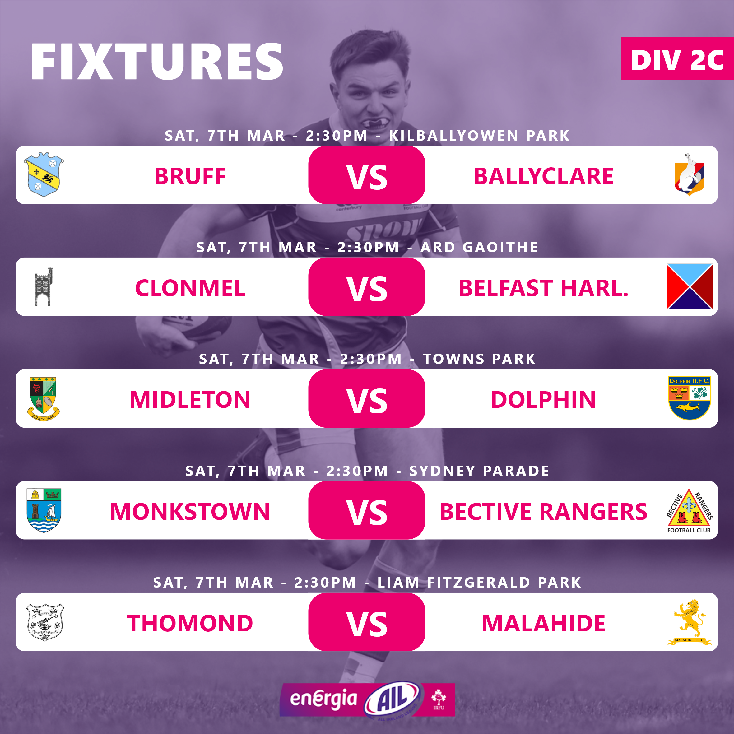 The title race is still wide open in 2C with just five points separating the top three teams. Clonmel (1) are at home to Belfast Harlequins (9), Bective (2) make the shirt trip to Monkstown (4) for our pick of the day, while Thomond (3) are at home to Malahide (10).