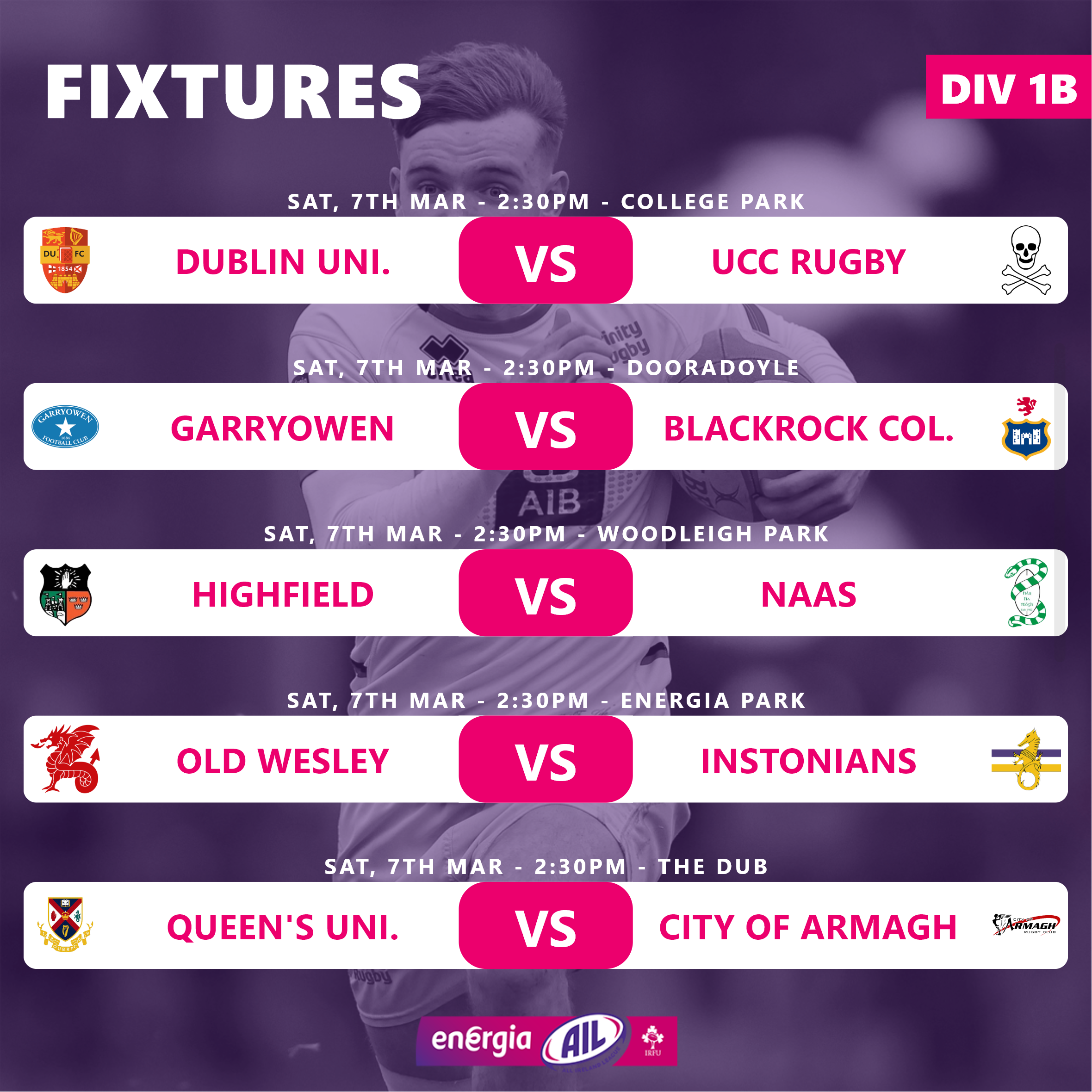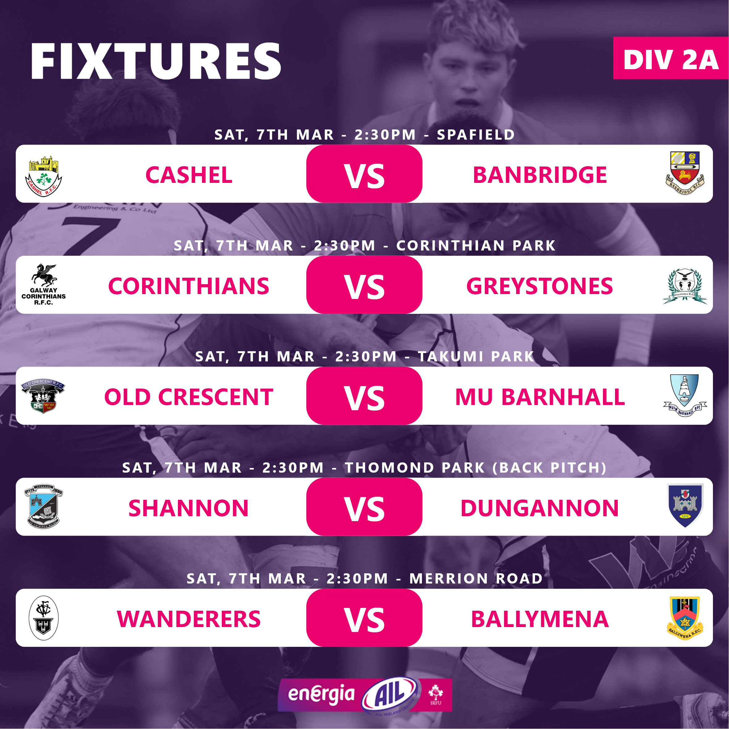 MU Barnhall (1) seem nailed on to claim the top spot with just four rounds left and a seventeen point lead but they will be intent on finishing strong. Next up for the unbeaten Leixlip side is a trip to Old Crescent (9). Meanwhile Shannon (3) are at home to Dungannon (2) in what promises to be match of the day in Division 2A.