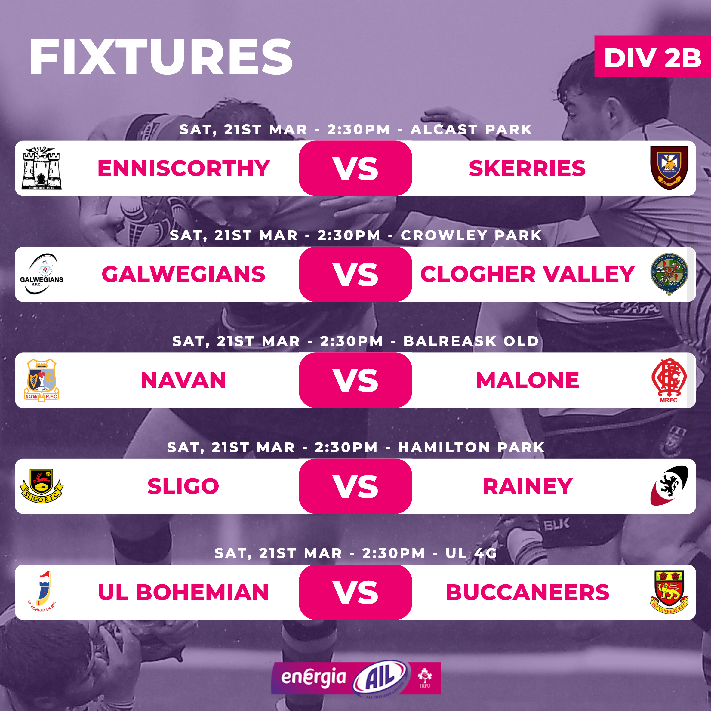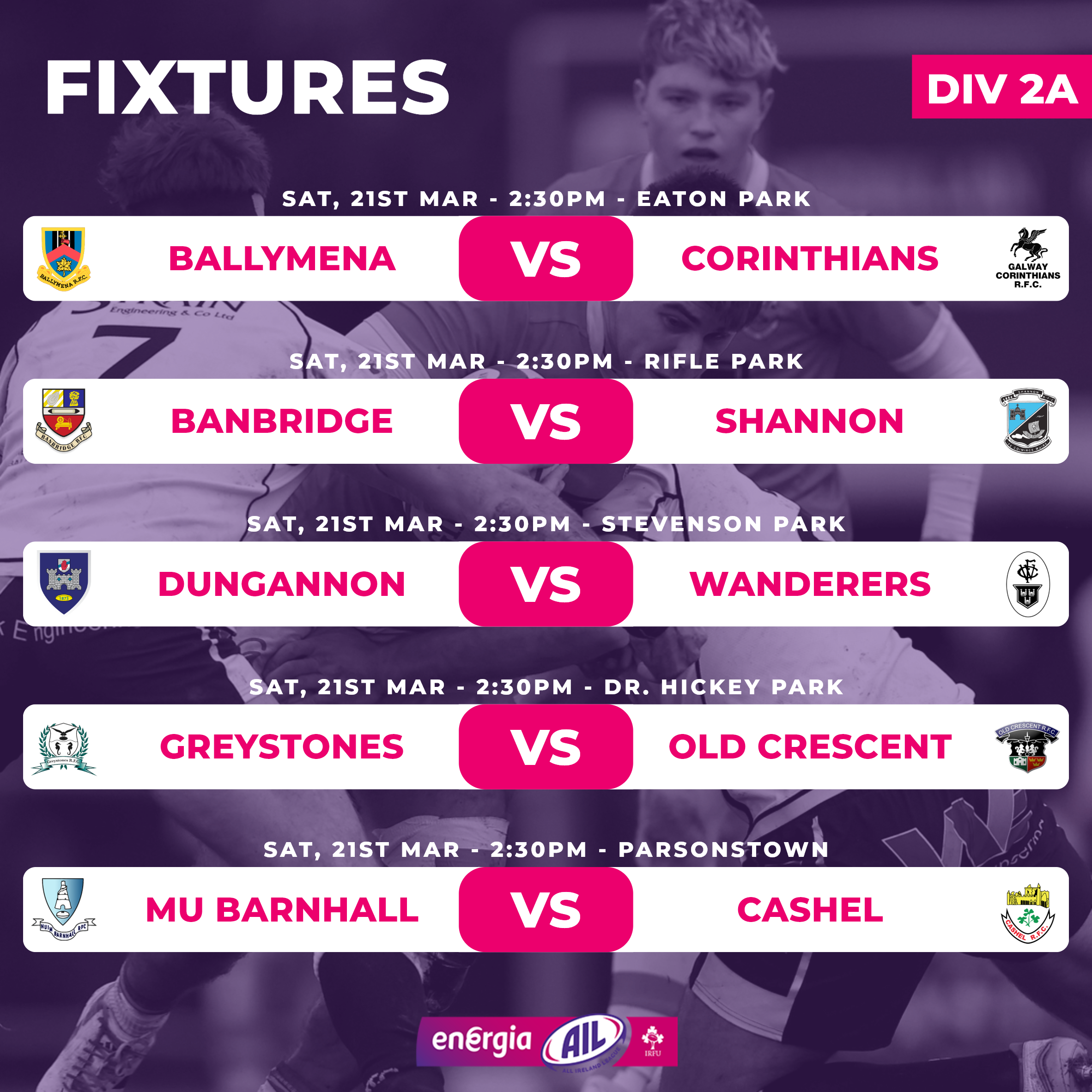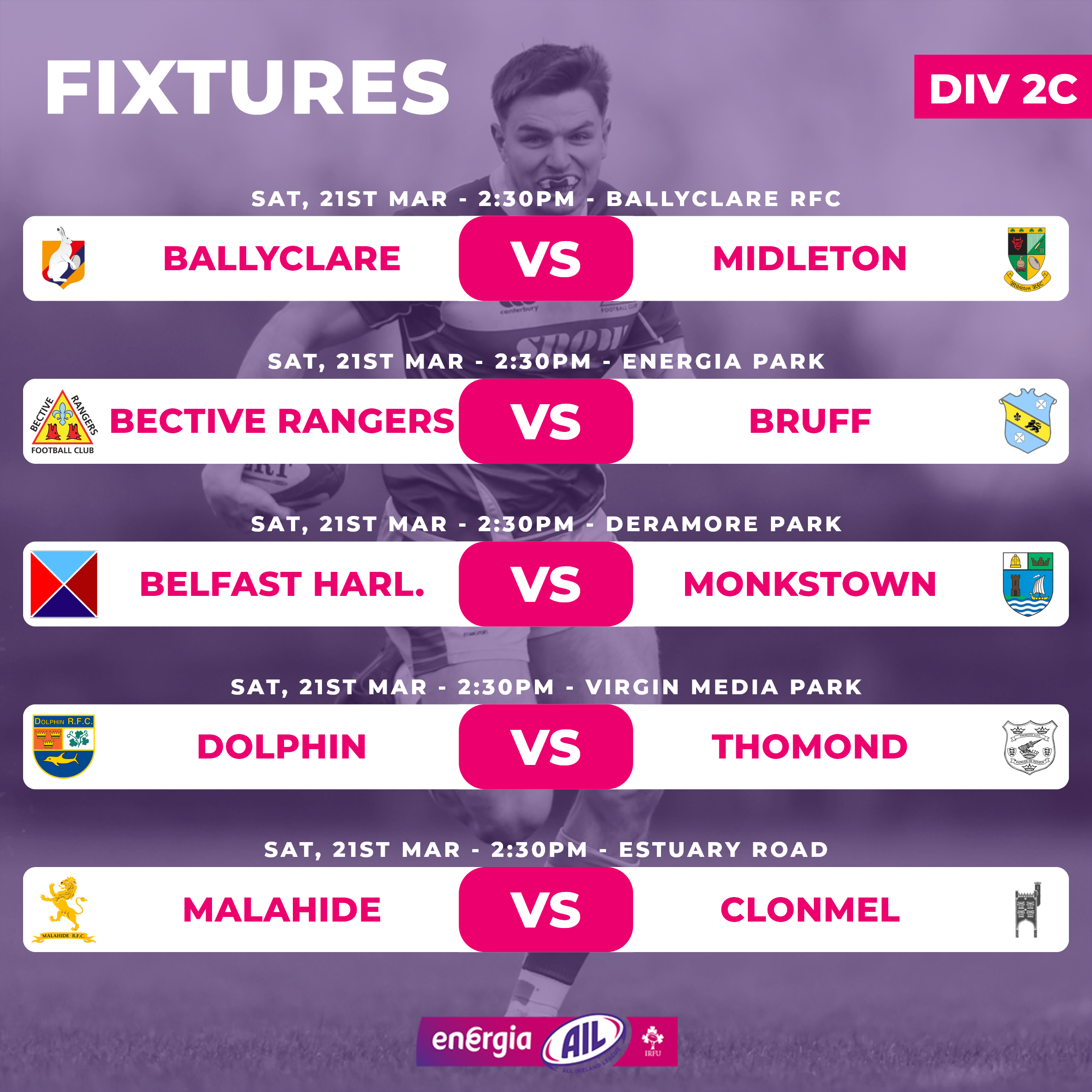 Top travels to bottom in 2C as Clonmel (1) are on the road to Malahide (10). Meanwhile Bective (2) are at home to Bruff (7) and Thomond (3) travel to Dolphin (5).