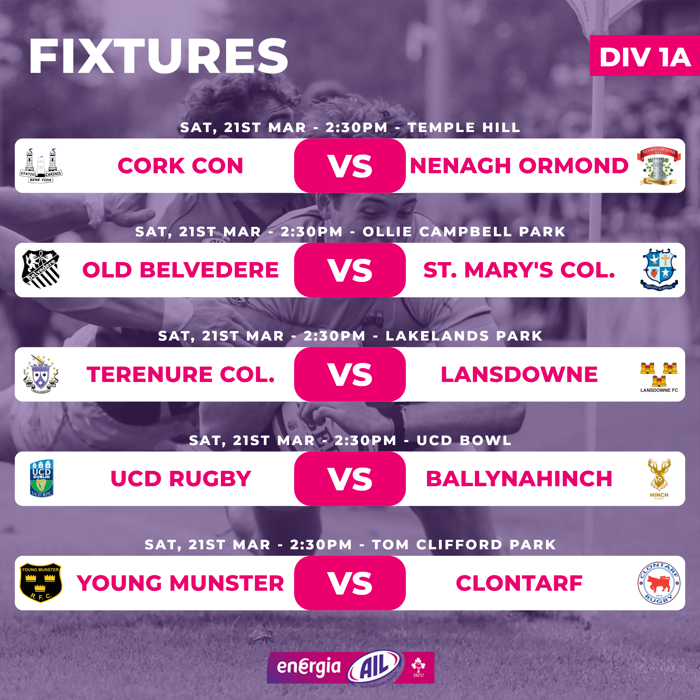 Cork Con (5) travel to Nenagh (10) knowing a win would put pressure on Lansdowne (4) who are away to Terenure (3) in the race for a coveted semi-final. There’s just a point between ‘Nure and Lansdowne and four more to Cork Con.