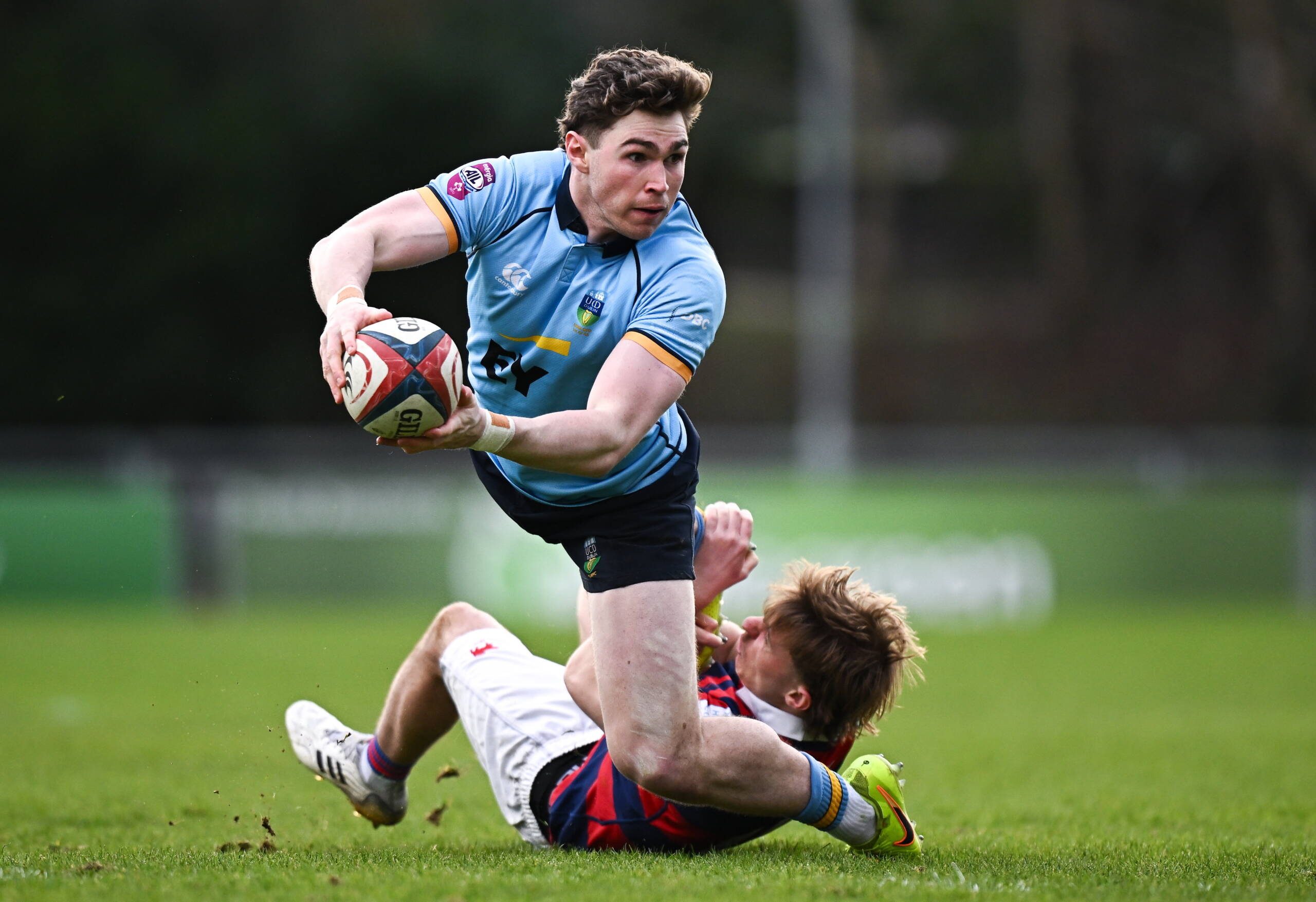 28 February 2026; Daniel Hurley of UCD is tackled by Noah Sheridan of Clontarf during the Energia All-Ireland League Men's Division 1A match between UCD RFC and Clontarf FC at Belfield Bowl in Dublin. Photo by Seb Daly/Sportsfile