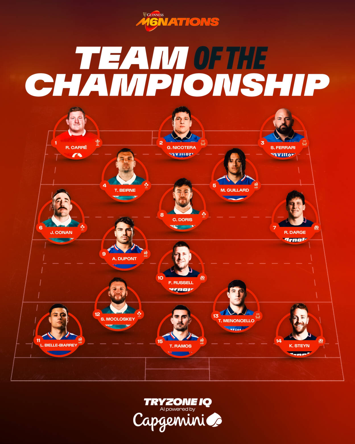 Ireland’s Stuart McCloskey, who finshed the tournament as joint-top for dominant carries (18), try assists (6), and turnovers won (8), is named alongside Italy’s Tommaso Menoncello in the centres.