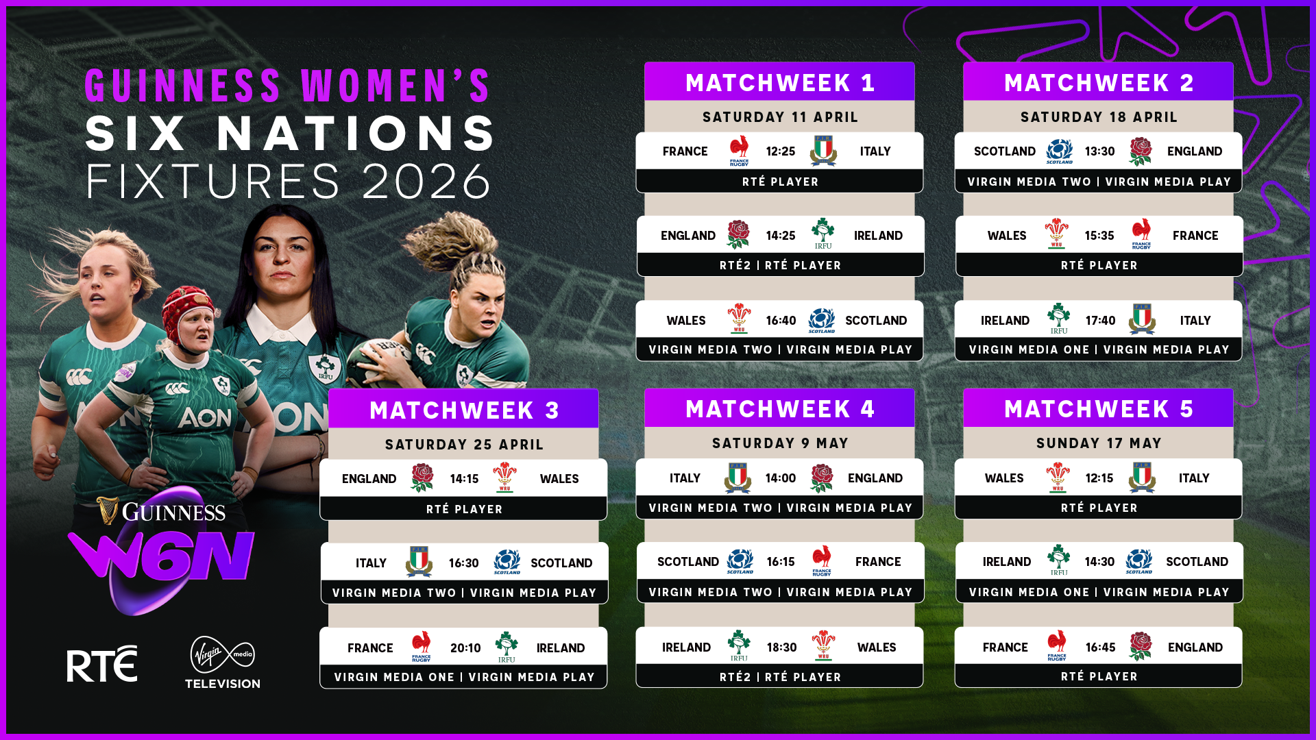 Brian Gleeson, Head of Sport, Virgin Media Television, said: “This year’s Women’s Six Nations creates a defining moment for Irish sport, with the Ireland Women taking to the Aviva Stadium for the first time, broadcast live on Virgin Media One and Virgin Media PLAY. We’re proud to make every one of our matches available live and free‑to‑air, so supporters across the country can be part of the excitement, passion and momentum driving the women’s game forward. In partnership with RTÉ, we look forward to delivering the expert analysis and comprehensive coverage fans deserve.”