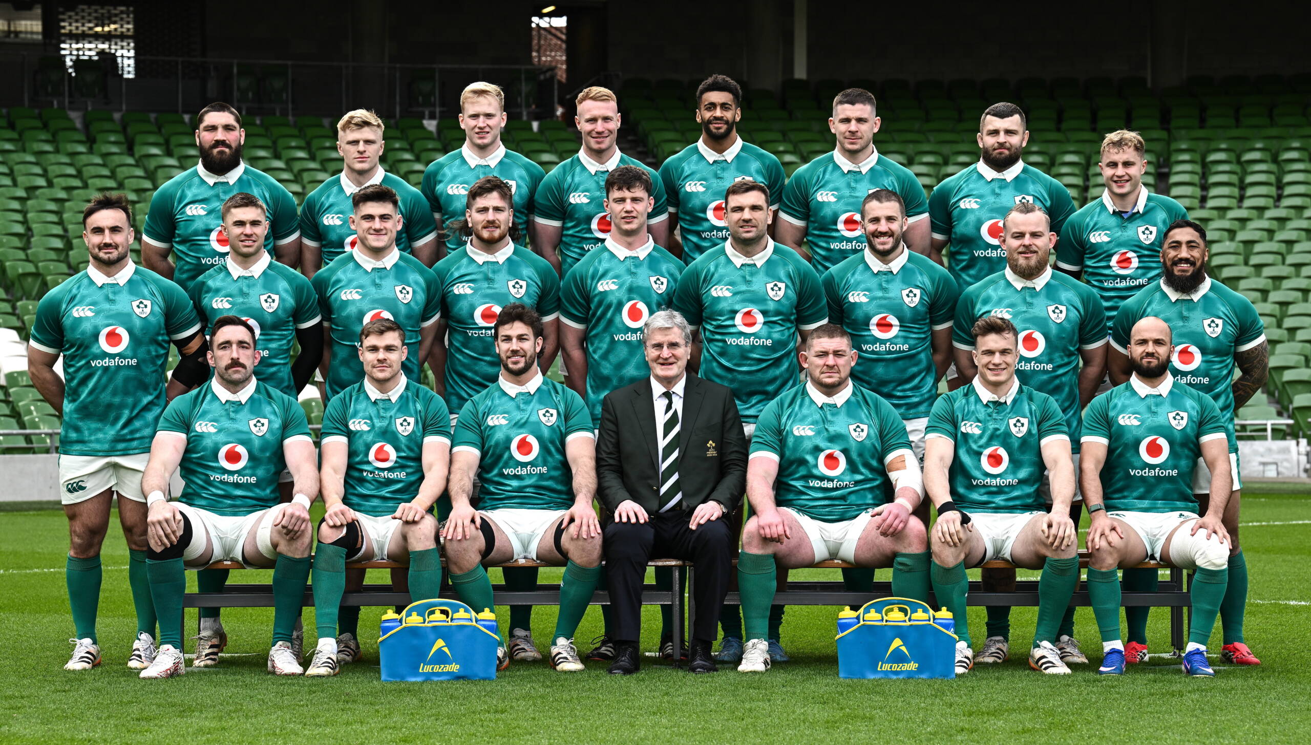 The Ireland matchday squad are pictured with IRFU President John O'Driscoll on the Aviva Stadium pitch ©Seb Daly/Sportsfile