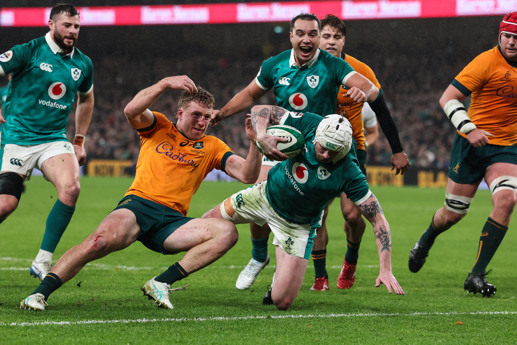 2025 Quilter Nations Series, Aviva Stadium, Dublin 15/11/2025 Ireland vs Australia Ireland’s Mack Hansen scores his sides third try of the match despite Australia’s James O'Connor Mandatory Credit ©INPHO/Gary Carr