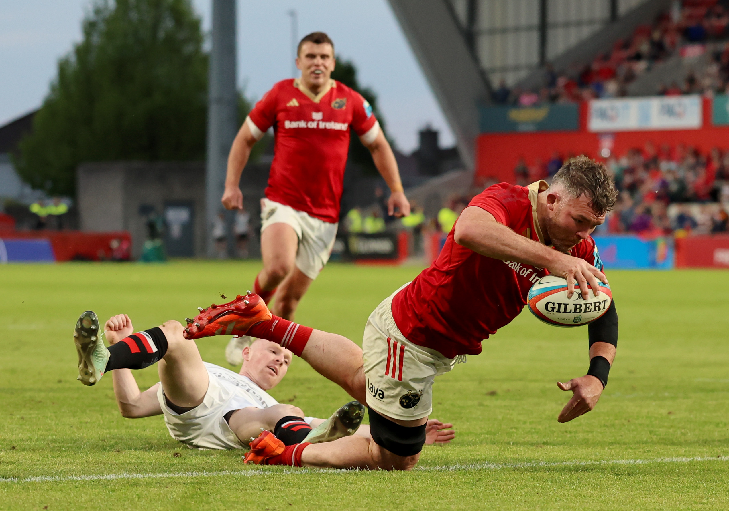 Peter O'Mahony is pictured scoring Munster's sixth and final try against Ulster at Thomond Park ©INPHO/James Crombie