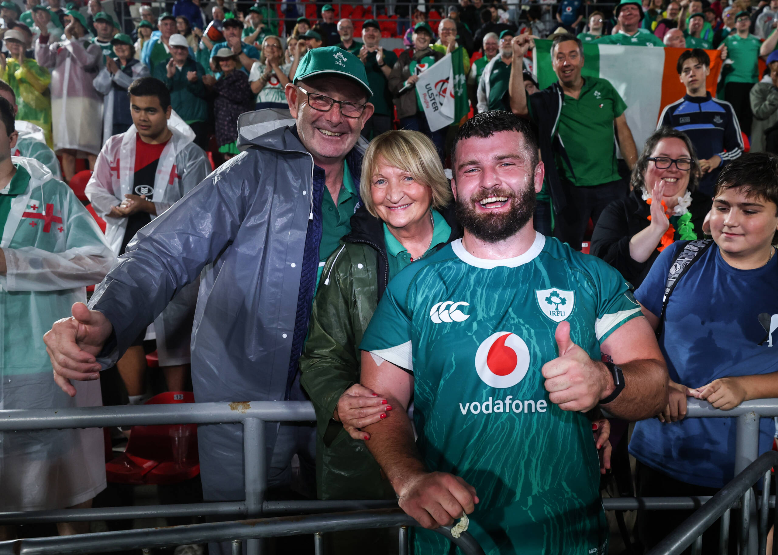 International Test Match, Mikheil Meshki Stadium, Tbilisi, Georgia 5/7/2025 Georgia vs Ireland Ireland's Michael Milne celebrates with his Dad Ger and Mum Pauline after the game Mandatory Credit ©INPHO/Ben Brady