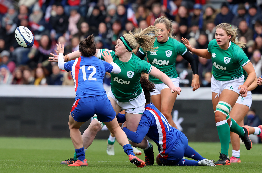 Ireland's Sam Monaghan is tackled by Caroline Drouin of France